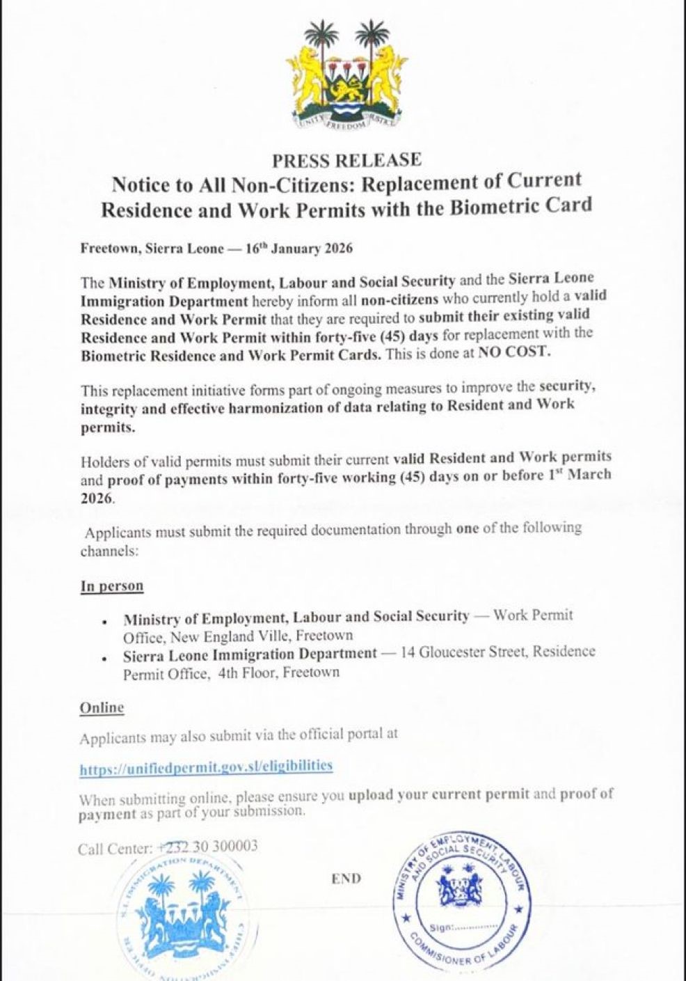 Sierra Leone İstihdam, Çalışma ve Sosyal Güvenlik Bakanlığı ve Sierra Leone Göç İdaresi tarafından 16 Ocak 2026 tarihinde yapılan Kamuoyu Duyurusunda, halihazırda geçerli Sierra Leone oturum ve çalışma iznine sahip tüm yabancı uyruklu kişilerin, mevcut izin belgelerini yeniBiyometrik Oturma ve Çalışma İzin Kartıyla değiştirmek üzere1 Mart 2026 tarihine kadar kırk beş (45) iş günü içinde aşağıda yer alan kanallar aracılığı ile teslim etmeleri gerektiği belirtilmektedir.